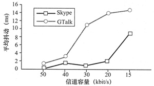 kbit/s時(shí),GTalk發(fā)生了很明顯的變化,傳輸速率降低到了35 kbit/s。這個(gè)變化使得其PESQ MOS分?jǐn)?shù)與Skype相比有所提高,而Skype的傳輸速率則接近信道容量。當(dāng)信道容量變?yōu)?0