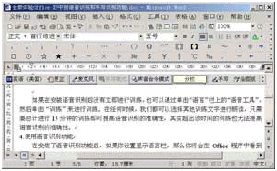 在安裝了語音識別功能后,如果你設(shè)置顯示語言欄,那么你將會在Office程序中看到如圖14所示的麥克風(fēng)圖標(biāo)(如果未看到,請從"工具"菜單中選中"語音"項),工作時將在"聽寫"和"聲音命令"模式之間進(jìn)行切換。