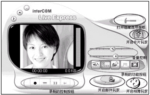 動(dòng)態(tài)視頻EMAIL,用這個(gè)軟件可以采用發(fā)送電子郵件的方式,將您的音容笑貌傳送到親朋好友的郵箱中,讓遠(yuǎn)方的她收到可“動(dòng)”的你。我們還是以奧美嘉公司的CD370電腦相機(jī)為例向大家介紹這個(gè)功能。在CD370附帶的驅(qū)動(dòng)光盤中就搭載了視頻EMAIL的制作軟件,其實(shí)它是Intercom的Live Express視頻應(yīng)用軟件,除了視頻EMAIL(郵件玩家)的功能外,它還具有“卡片玩家”及“相薄玩家”等功能,我們將在以后的文章中為大家逐一介紹。首先,打開Live Express的主程序“影音玩家”,可以見到程序界面上分布著大大小小不同的按鈕,是不是一時(shí)間找不到感覺了?不用著急,下面請(qǐng)跟著我的步驟來操作:
