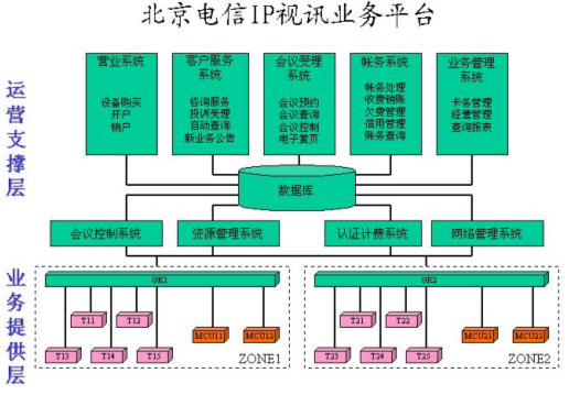 在整個運營支撐層的系統(tǒng)中,主要包括四大系統(tǒng),即會議控制系統(tǒng)、資源管理系統(tǒng)、認(rèn)證計費系統(tǒng)、網(wǎng)絡(luò)管理系統(tǒng)。除此之外,還有其它幾個輔助系統(tǒng),包括營業(yè)系統(tǒng)負(fù)責(zé)為客戶開戶和銷戶,終端注冊等處理;客戶服務(wù)系統(tǒng)提供咨詢服務(wù)、投訴受理、自動查詢和幫助客戶進(jìn)行會議預(yù)約,在資源不足的情況下進(jìn)行會議調(diào)度等;會議受理系統(tǒng)是面向客戶提供會議電視業(yè)務(wù)預(yù)約、會議狀態(tài)查詢、會議控制服務(wù),由用戶自助完成預(yù)約會議和控制會議的操作;賬務(wù)系統(tǒng)負(fù)責(zé)賬務(wù)方面的管理,包括賬務(wù)管理,收費銷賬,催繳欠費、銀行繳費等;業(yè)務(wù)管理系統(tǒng)主要是記賬卡的卡務(wù)處理、經(jīng)營管理、查詢報表等。