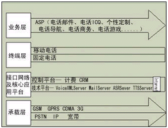 企業(yè)利用語音門戶,可以通過節(jié)省人工座席成本實(shí)現(xiàn)低成本地發(fā)布信息,提供客戶服務(wù),而且可以實(shí)現(xiàn)其它有價(jià)值的業(yè)務(wù),開創(chuàng)新的市場(chǎng)空間和利潤(rùn),其業(yè)務(wù)系統(tǒng)層次如圖2所示。