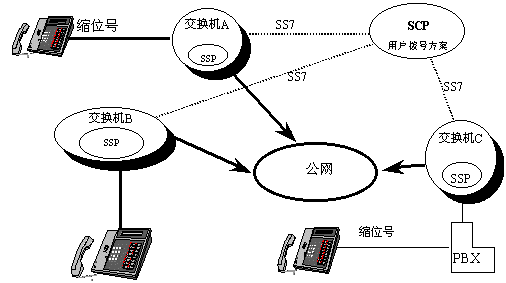 縮位撥號(hào)是指用一短的撥號(hào)(如三位)代替一長(zhǎng)的撥號(hào)(如八位)的撥號(hào)方案。如下圖所示的智能網(wǎng)中,交換機(jī)A、B、C所有用戶的撥號(hào)方案數(shù)據(jù)都由SCP管理,當(dāng)交換機(jī)收到用戶的縮位撥號(hào)后,通過SS7鏈路訪問SCP數(shù)據(jù)庫,返回對(duì)應(yīng)的電話號(hào)碼,然后交換機(jī)通過公網(wǎng)把呼叫接通到該電話號(hào)碼,就和用戶直接撥打該電話號(hào)碼一樣。