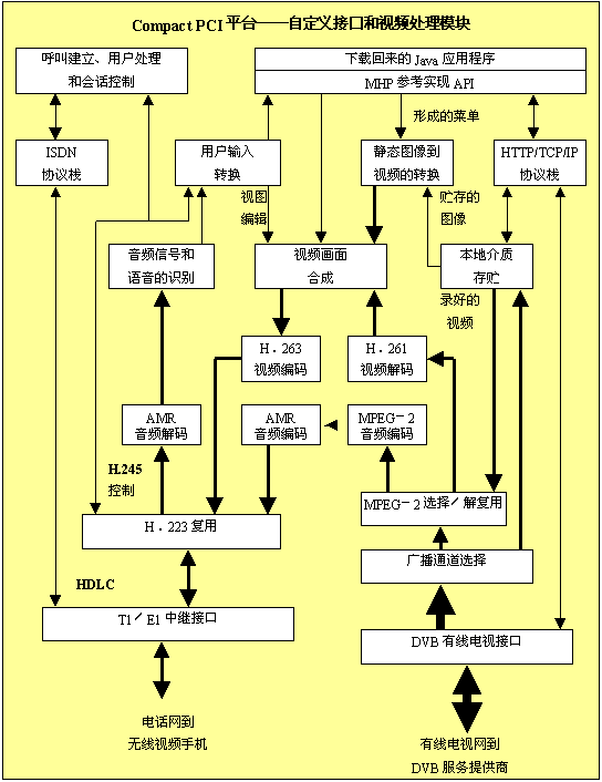 總線。T1/E1中繼和有線電視的接口模塊可以合并,包括其中必須的視頻和音頻處理。但是,用于Compact PCI系統(tǒng)的、新的、高帶寬的交換結(jié)構(gòu)使得把這些功能分離成不同的模塊成為可能,免除媒體通過(guò)PCI總線的必要。
