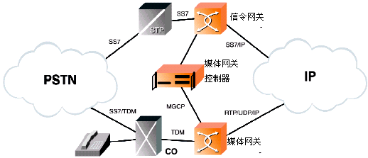 IP電話技術把話音、傳真數(shù)據(jù)和IP網(wǎng)絡無縫地集合到了一起。因特網(wǎng)工程任務組(IETF)已經(jīng)建議了一個功能模型,來橋接包交換的IP網(wǎng)和電路交換的PSTN,這些橋接設備就是:信令網(wǎng)關(SG)、媒體網(wǎng)關(MG)、和媒體網(wǎng)關控制器(MGC)。(請參看圖1)。MGC通常又被叫做軟交換,正如它的名字表達的意思一樣,MGC控制著媒體從電路交換領域經(jīng)過媒體網(wǎng)關的網(wǎng)絡傳送到基于包的領域。呼叫控制消息首先送達SS7信令網(wǎng)關,轉換成網(wǎng)關網(wǎng)絡中的MGCP(媒體網(wǎng)關控制協(xié)議)來控制媒體流,完成呼叫的控制、接續(xù)。話音、傳真和圖象介質都是從PSTN交換網(wǎng)通過這些新一代的媒體網(wǎng)關連接到IP網(wǎng)的。