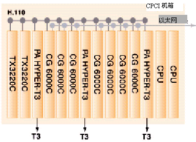 HYPER-T3接入適配板,它用于通過T3線上的1344個端口從PSTN接入語音和傳真媒體。這些媒體會從DS3轉換到DS0,然后通過H.110總線發(fā)送給6塊CG6000C中的一塊。CG6000C會壓縮這些語音和傳真媒體,然后用UDP/IP上實時協(xié)議(RTP)對它們進行打包。再通過板上的兩個以太網(wǎng)接口發(fā)送到一個語音級的IP包網(wǎng)絡上。請注意,每種板都使用了N+1板卡級的冗余備份。