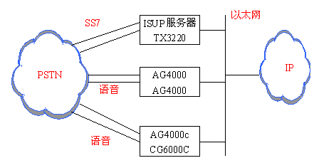 系統(tǒng)中ISUP服務(wù)器通過SS7鏈路和PSTN連接,通過IP網(wǎng)絡(luò)和語音處理機(jī)連接,這兩個(gè)連接傳送的是信令信號。語音處理機(jī)通過話路和PSTN連接,這個(gè)連接傳輸?shù)氖钦Z音。