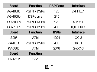 為具體起見(jiàn),圖6給出一個(gè)960話(huà)音端口的應(yīng)用方案,其中用到了三種NMS公司的設(shè)備:AG-4000c、S007和TX-3220c,圖中未列出用來(lái)運(yùn)行應(yīng)用程序的CPU板(AG4000系列板卡不含CPU,而AG600eC包含了CPU)。