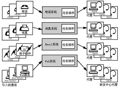 為了提高工作效率,當前的跨媒體聯系中心必須提供新的功能和特點。例如需要新的隊列結構,具有處理和分配一個邏輯通路上不同通信媒體請求的能力。所有的入站查詢均由新的負載隊列系統(tǒng)處理。
