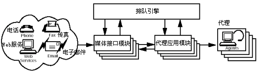 媒體交互模塊是跨媒體隊列結構的通信入口。聯系中心所使用的每一種類型的媒體信道都與不同的模塊相關聯,這些模塊檢測不同各自信道上的用戶請求,并將他們轉交給該隊列引擎。