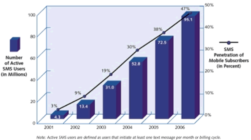 中國的SMS更加有趣. 發(fā)送的SMS消息預(yù)計(jì)從2001年的190億增長到2002年的600億. 到2007年,