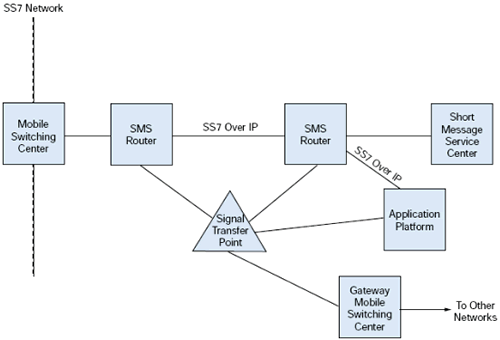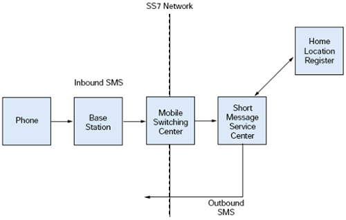 從MSC, SMS消息在SS7網(wǎng)絡(luò)中發(fā)送到短消息中心(SMSC), 一個(gè)網(wǎng)絡(luò)的標(biāo)準(zhǔn)部分. SMSC向Home Location