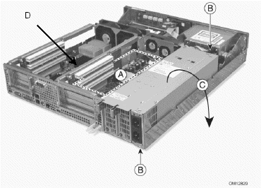7. 抬起電源盒的基座,然后旋轉(zhuǎn)以便能將其放置到服務(wù)器單元外(這樣做不用斷開纜線,但操作時要小心,以保證纜線不受擠壓);