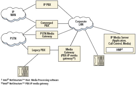 IP座席和IP媒體服務(wù)器連接到內(nèi)部網(wǎng). 公司內(nèi)部網(wǎng)可以通過PSTN-IP媒體網(wǎng)關(guān)來連接PSTNA. 企業(yè)內(nèi)不斷增加的使用VoIP技術(shù)的需求使IP媒體服務(wù)器的需求也不斷增加.