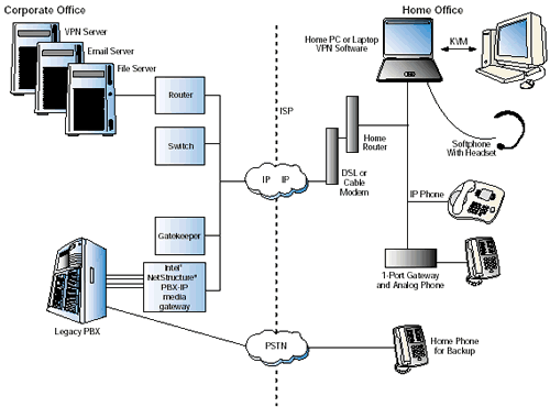 為了實(shí)現(xiàn)這個(gè)VoIP解決方案,PBX-IP網(wǎng)關(guān)連接到了辦公室里的原有的PBX和關(guān)鍵系統(tǒng)上,還有網(wǎng)守軟件實(shí)現(xiàn)一些呼叫的路由以及地址轉(zhuǎn)換。然后遠(yuǎn)程辦公者連接到了網(wǎng)關(guān)上--最終連接到公司PBX上--或者使用IP軟電話,或者一個(gè)實(shí)際的IP電話,或者一個(gè)單端家庭網(wǎng)關(guān)連接到模擬耳機(jī)上。