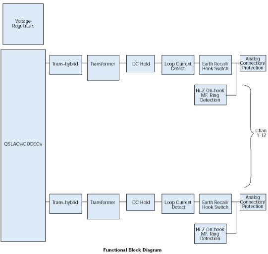 來自12個環(huán)路電話線的信號首先通過電話線路接口連接到D/120JCT-LS板卡上,該接口提供瞬變保護和電磁干擾(EMI)刪除(參見子板塊圖)。這些電話線路接口使用可靠的晶體摘掛機開關(guān)(無機械接觸)和FCC-Part