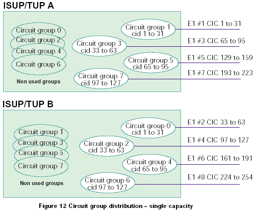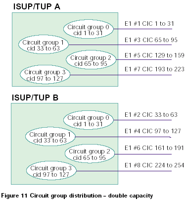 兩個系統(tǒng)中的電路組既可以從0開始編號,也可以兩個系統(tǒng)間隔標(biāo)號。如果使用第一種方法,整個系統(tǒng)的容量就是單ISUP/TUP協(xié)議層系統(tǒng)的容量的2倍,如果使用第二種方法,系統(tǒng)總?cè)萘颗c單ISUP/TUP協(xié)議層系統(tǒng)的容量相同。對于這兩種情況,每半部分控制對立的CIC范圍,如圖11和12所示: