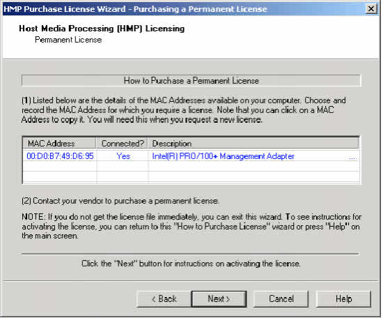 5. 聯(lián)系你的廠家購買一個永久許可證。你必須提供從在4步中得到的MAC地址?色@得的許可證列表參見表3""HMP