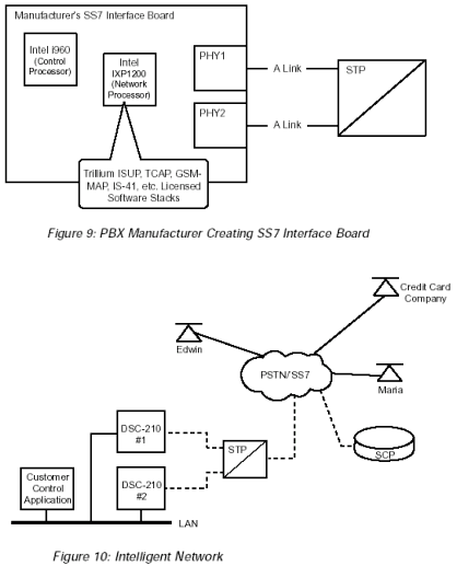 SS7產(chǎn)品可以被用來建立SS7網(wǎng)絡(luò)元素(NEs)和高級(jí)智能網(wǎng)絡(luò)(AIN)平臺(tái),比如: