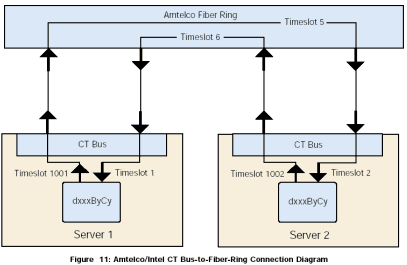 為了能夠共享時(shí)隙,將本地服務(wù)器上的CT總線連接到Amtelco光纖環(huán)路,然后從光纖環(huán)路連接到另外一個(gè)服務(wù)器的本地CT總線。圖11是一個(gè)簡(jiǎn)單圖示,顯示了一個(gè)服務(wù)器1上的中間設(shè)備(dxxxBxCx)到另外一個(gè)服務(wù)器2上的中間設(shè)備(dxxxBxCx)的連接。