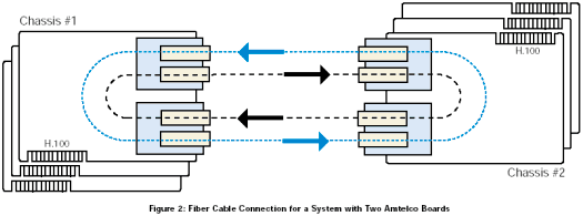 該配置由兩個(gè)服務(wù)器組成,其中一個(gè)配置成主機(jī),另外一個(gè)配置成客戶機(jī)。主機(jī)通過(guò)光纖環(huán)路為整個(gè)系統(tǒng)提供時(shí)鐘,客戶機(jī)則通過(guò)光纖環(huán)路得到時(shí)鐘。對(duì)于主機(jī)服務(wù)器,Amtelco卡需要在Dialogic®