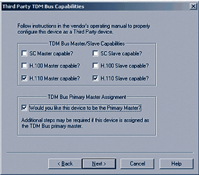 現(xiàn)在需要選擇合適的TDM總線的功能,對(duì)合適的類(lèi)型(對(duì)于PCI,選擇H.100,對(duì)于CompactPCI,選擇H.110),您需要選擇主選項(xiàng)和客戶端選項(xiàng)。如果該設(shè)備將要為CT總線(客戶端服務(wù)器)提供主時(shí)鐘,選中TDM總線主控制選項(xiàng),然后單擊下一步。圖5顯示的是CompactPCI服務(wù)器在系統(tǒng)中配置為客戶端服務(wù)器的選擇。