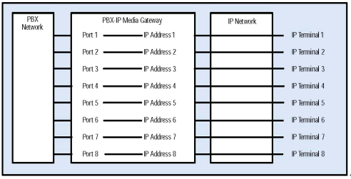 每一個(gè)PBX-IP 媒體網(wǎng)關(guān)的 PBX 端口都被設(shè)定了一個(gè)相應(yīng)的IP地址, 從PBX某個(gè)端口來(lái)的PBX網(wǎng)絡(luò)中的呼叫通過(guò)IP網(wǎng)絡(luò)被路由到制定的IP地址.