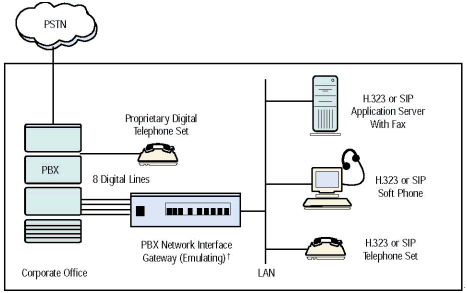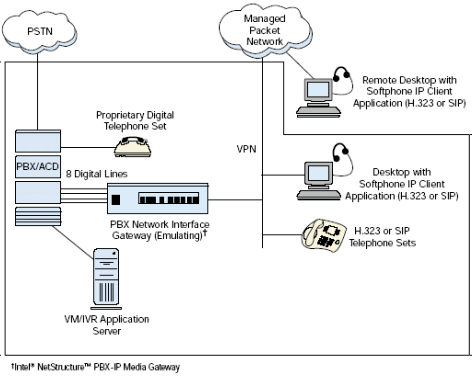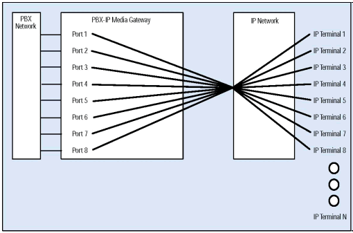 PBX-IP 媒體網(wǎng)關(guān)可以把IP電話連接到傳統(tǒng)PBX上, 給PBX集成了網(wǎng)絡(luò)應(yīng)用, 擴(kuò)展了PBX, 集成了企業(yè)局域網(wǎng)或廣域網(wǎng)語(yǔ)音,