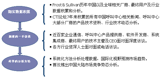 Frost & Sullivan 和 CTI論壇(www.leyoulehuo.com)共同組成的調(diào)研小組,在查閱了大量資料的基礎(chǔ)之上,以企業(yè)通信及呼叫中心的設(shè)備應(yīng)用、投資計(jì)劃以及相關(guān)廠商的市場表現(xiàn)為出發(fā)點(diǎn),通過對企業(yè)通信及呼叫中心重要應(yīng)用企業(yè)、在市場占主導(dǎo)地位的二十多家設(shè)備廠商、二十多家軟件開發(fā)商、十幾家系統(tǒng)集成商、數(shù)家外包運(yùn)營商的深度訪談,參閱內(nèi)部相關(guān)報(bào)告及數(shù)據(jù)庫,對數(shù)據(jù)的來源和數(shù)據(jù)的準(zhǔn)確性進(jìn)行了詳細(xì)核對與論證;憑借參與調(diào)研人員的多年從業(yè)經(jīng)